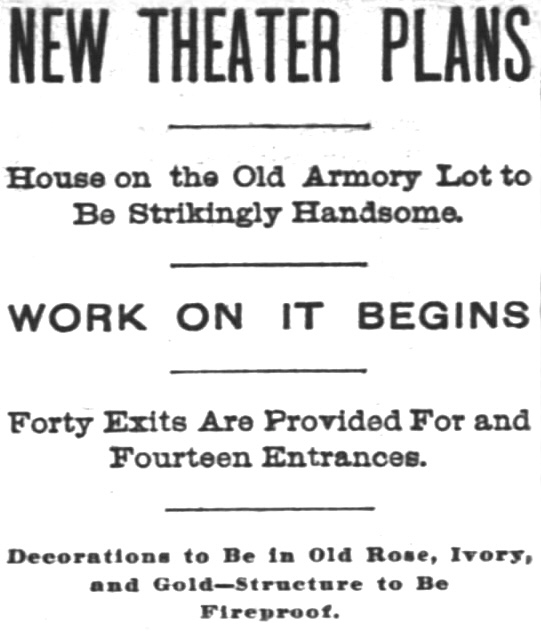 The new theater will be owned by Will J. Davis and Harry J. Powers of Chicago and Charles Frohman, Al Hayman, and Klaw & Erlanger of New York city. The building will be devoted exclusively to theatrical purposes and will be constructed entirely or stone, the first story to be of polished granite. The exterior is designed in the classic style, while in the matter of the interior draperies, carpets, and furnishings, a special design furnished by the architects will be adopted.