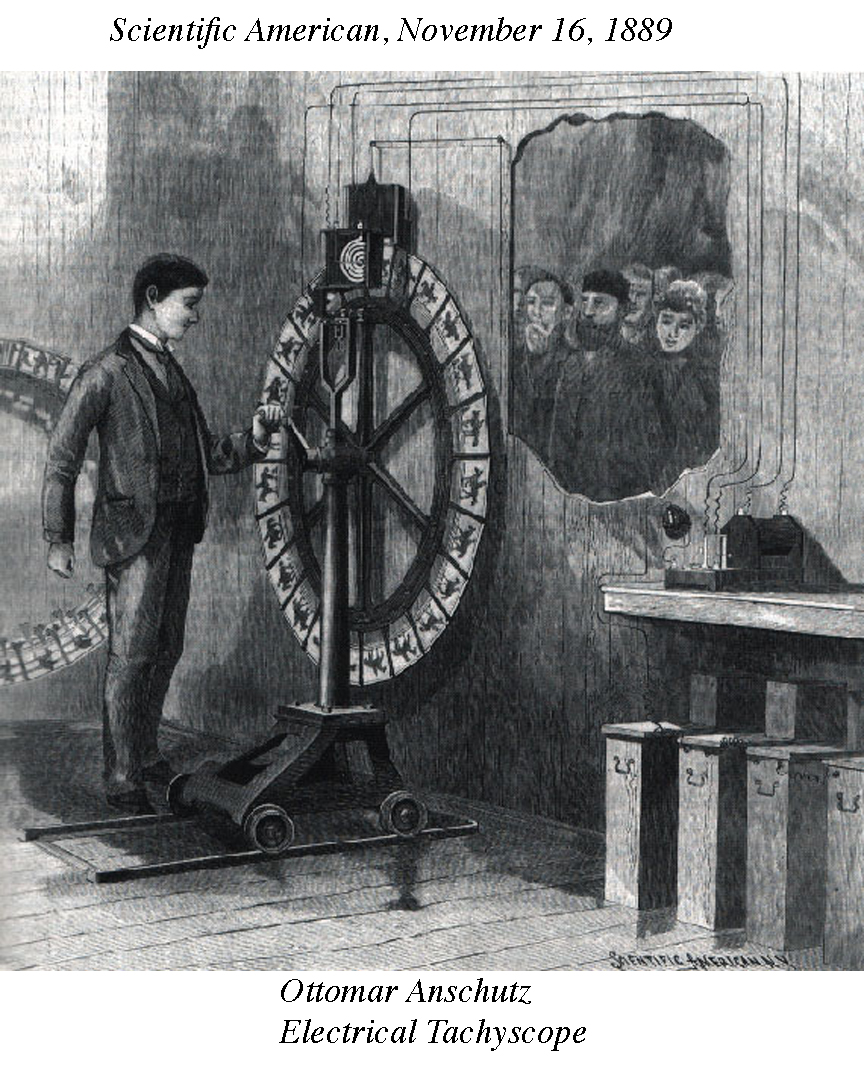 In the Tachyscope a circular glass plate revolved in the cabinet of the machine, and the pictures, or photographs, appeared in succession as it turned, they being placed on the outer rim of the plate. As each picture came into position there was an incandescent flash in the cabinet, which brought it into view. The plate took only three seconds to revolve, so the picture show did not last long in those days.