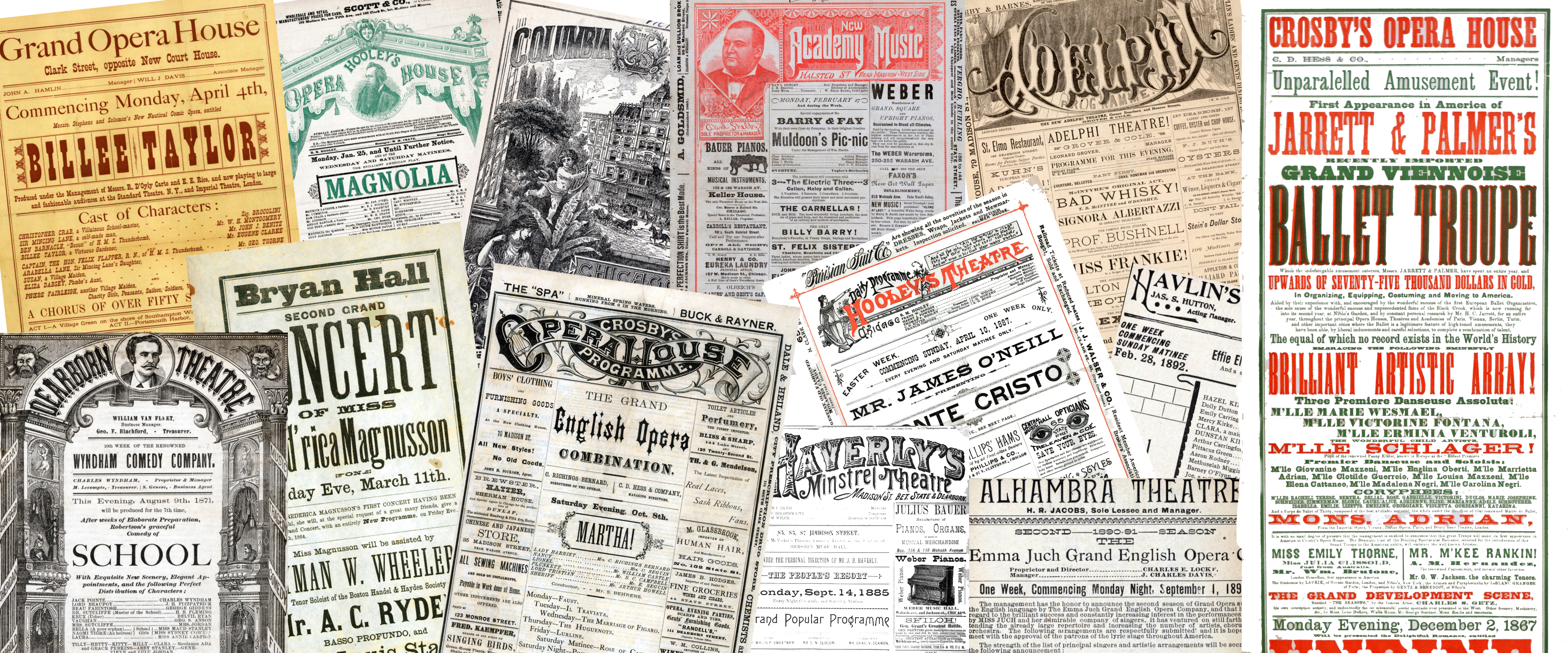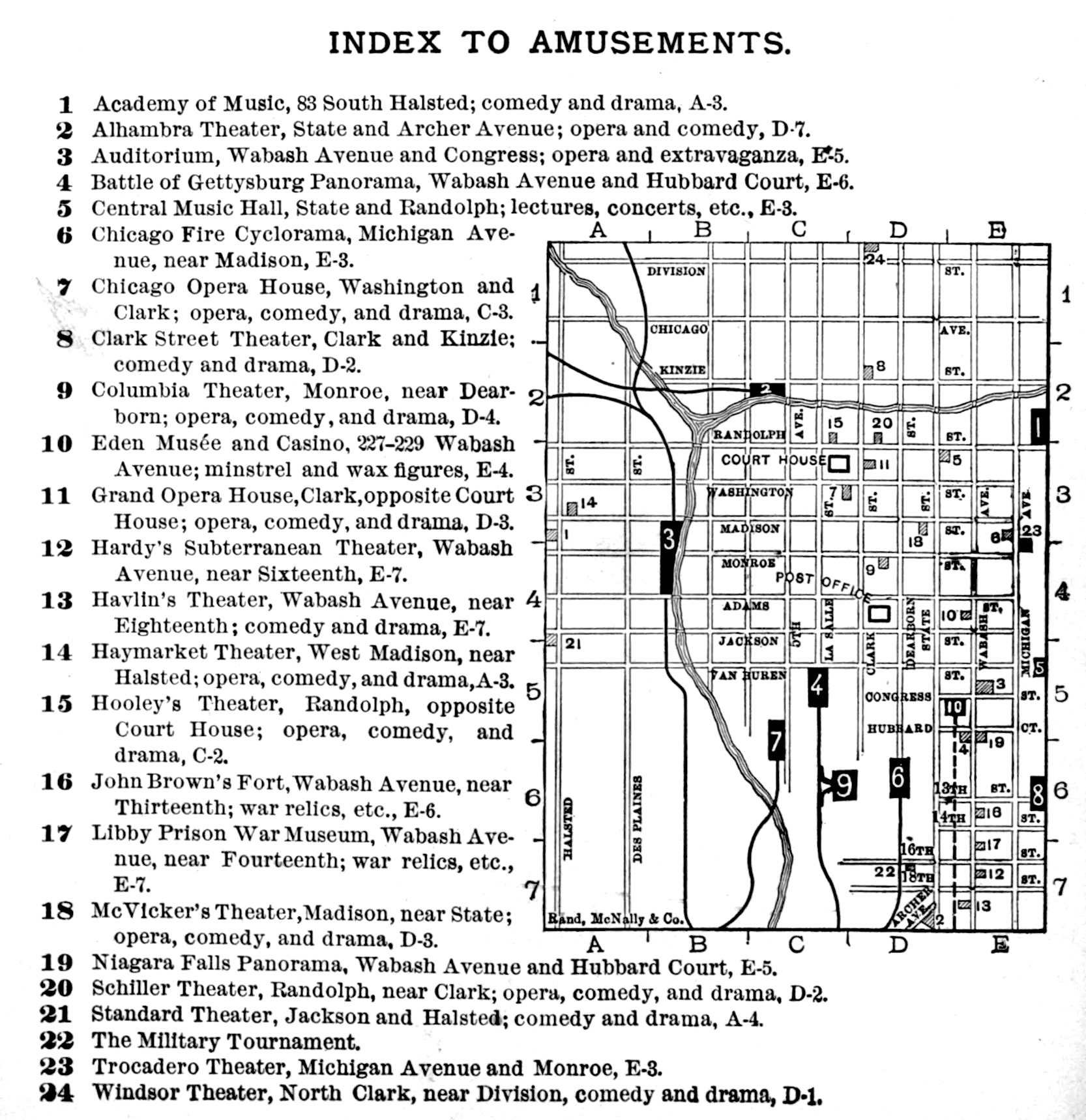 McCormick Hall, Chicago Museum, The Casino, H. R. Jacob’s Clark Street Theatre, Imperial Music Hall, Star Theater, Victoria Theater, New American Theater, and Sydney J. Euson’s Theatre—NE cor Clark and Kinzie